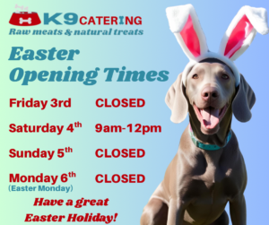 All orders are dispatched frozen, K9 catering cannot accept responsibility for any items that arrive defrosted following altered or rearrange deliveries.