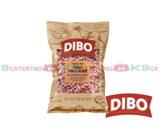 Dibo Turkey, Pork & Salmon Mince (1kg) is a balanced raw food blend made with 35% turkey, 35% pork, 20% salmon, and 10% bone. Rich in protein and Omega-3 fatty acids, it supports healthy muscles, joints, skin, and coat. Grain-free and additive-free, this frozen mince is a wholesome, natural choice for dogs of all breeds.